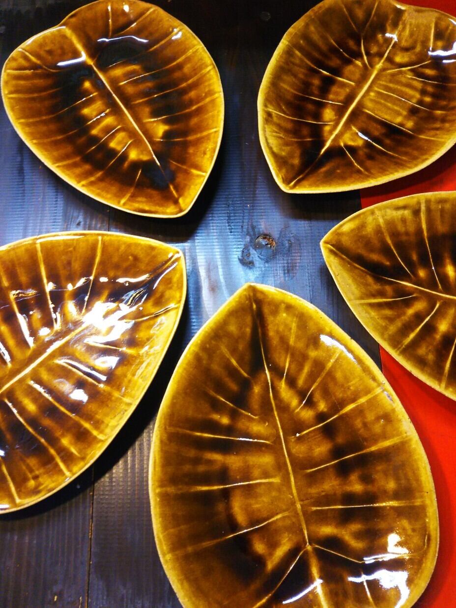 あめ釉の葉皿です。里芋の葉のかたちに作っています。南国風の形ですが、落ち着きのある色合いです。葉脈や色は、一つひとつ手作りしていますので、それぞれ微妙に違います。パスタを取り分けたり、ケーキをのせたり、少し大きめの銘々皿として使えます。電子レンジ、食洗機大丈夫です。お値段は1つのお値段です。