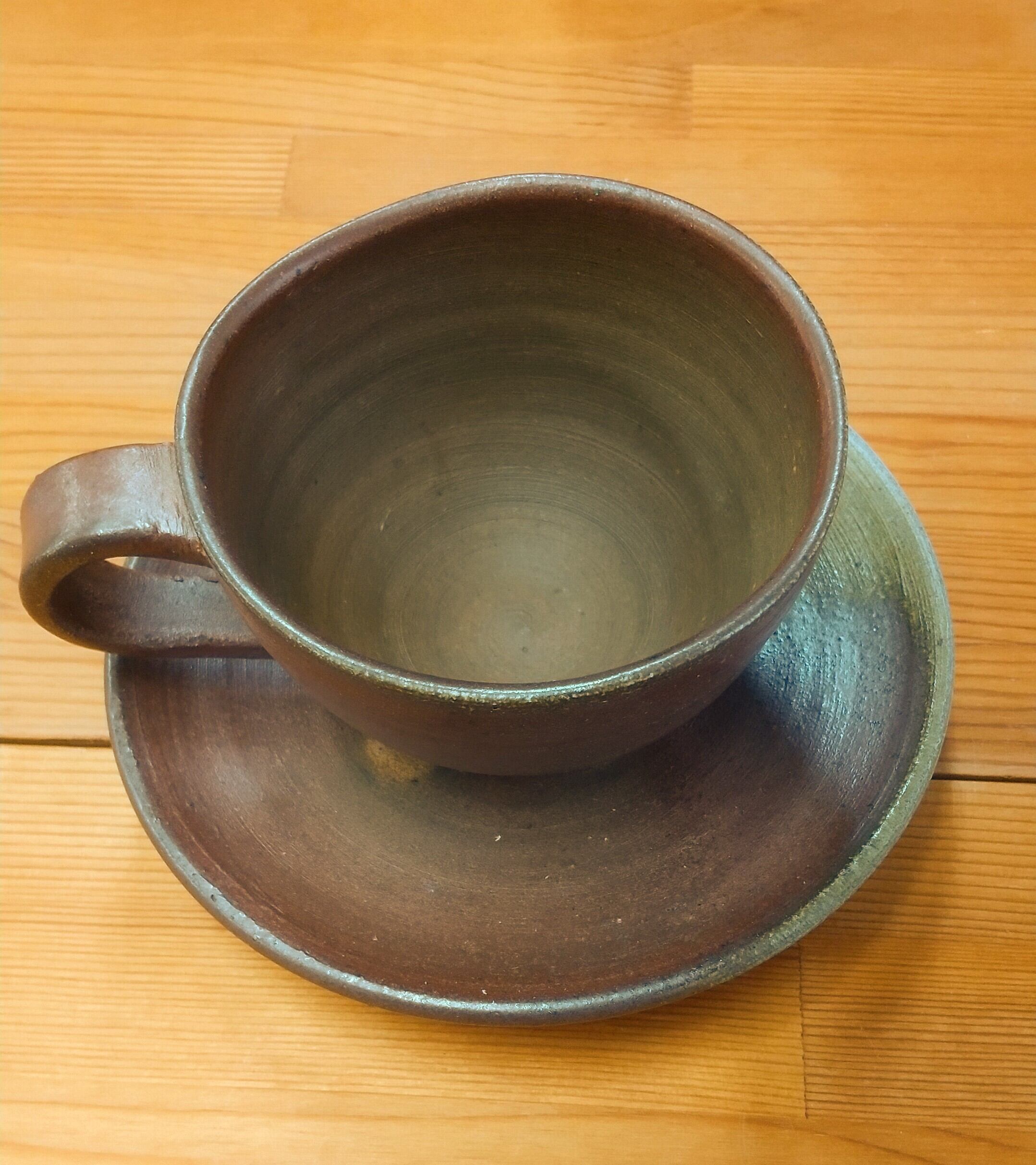 穴窯で焼成した焼締めのカップ&ソーサーです。